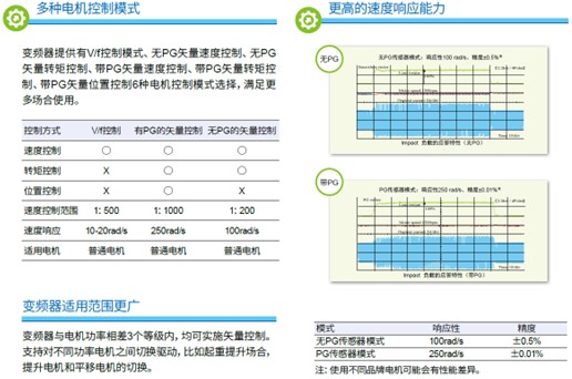 凭借我司独特的先进高性能电流闭环矢量控制技术和电机参数自检功能,实现了更高的精度控制和高响应速度